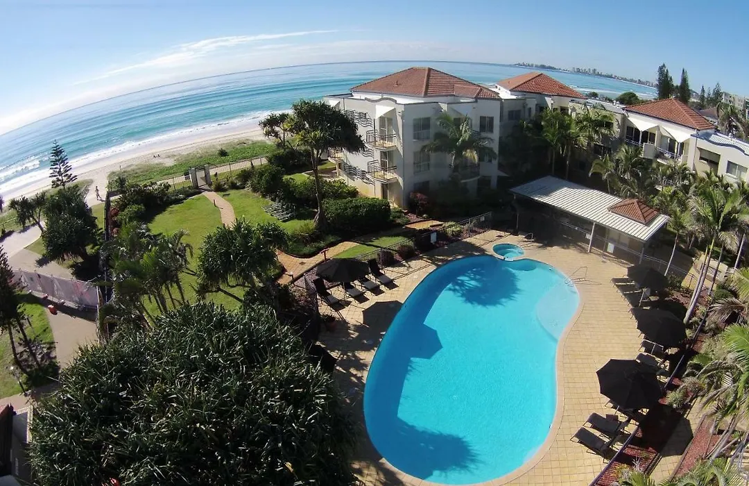 Golden Riviera Absolute Beachfront Resort offers 74 luxury apartments with direct beach access and a large outdoor heated pool. This Gold Coast hotel is situated in Tugun, featuring a sauna, gym, and BBQ areas amidst lush tropical gardens.